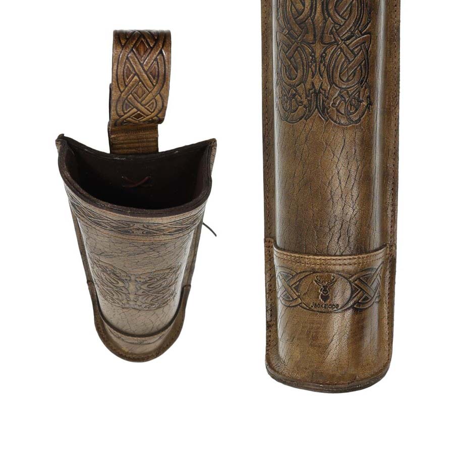 The Jackalope Dragun Traditional Back Quiver is made of robust, high-quality smooth leather. The quiver is decorated with a stamped Celtic ornament with dragons. The spacious arrow quiver is equipped with an adjustable carrying strap which has a quick release, which makes putting on and taking off the arrow quiver very easy.